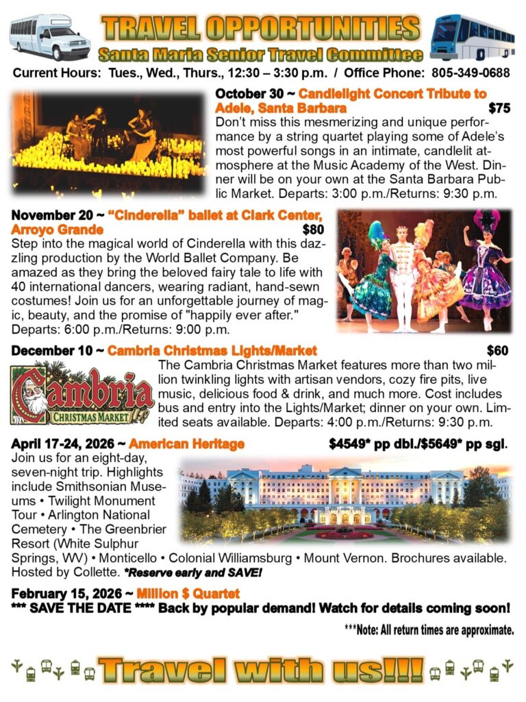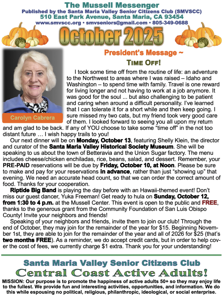 Club receptionists are available from 10:00 a.m. to 2:00 p.m., Monday through Friday, on the days the Mussell Center is open. Phone 805-349-0688 or contact us using the form at the bottom of this page.